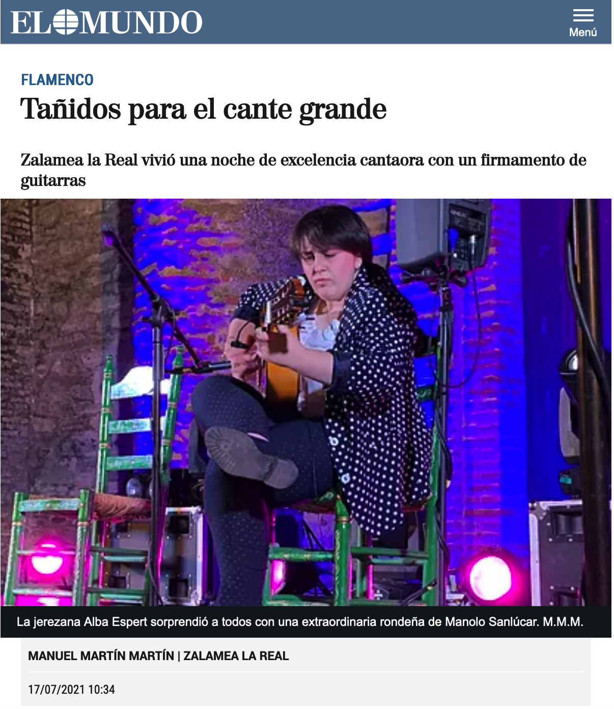 But the angels of the guitar oratorio flew off at the announced time and with a flawless sound to the sound of the Jerez-born Alba Espert, a concert guitarist who caused a pleasant silence with Manolo Sanlúcar's rondeña, continued with a great granaína. Poetic breath in his right hand and he threw an overflowing passion in the taranta, with what at 24 years old he left a sense of aesthetics and fidelity to the executed styles to the memory.