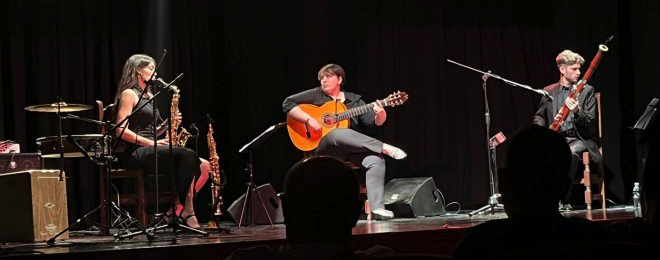 En primer lugar, pudimos disfrutar del concierto del ‘Grupo Sinfónico’ a cargo de la joven casaricheña Catalina Sánchez, virtuosa en el saxo flamenco, que estuvo acompañada por Alba Espert, a la guitarra, y Niño Rubén, al fagot.