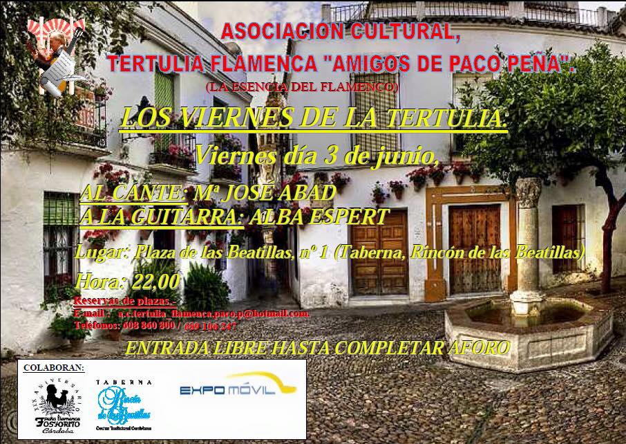 Con motivo de la celebración del mes flamenco de Córdoba por antonomasia y como cierre de la Temporada 2015/2016, la Asociación Cultural, Tertulia Flamenca "Amigos de Paco Peña" organiza "Los Viernes Flamencos de la Tertulia".