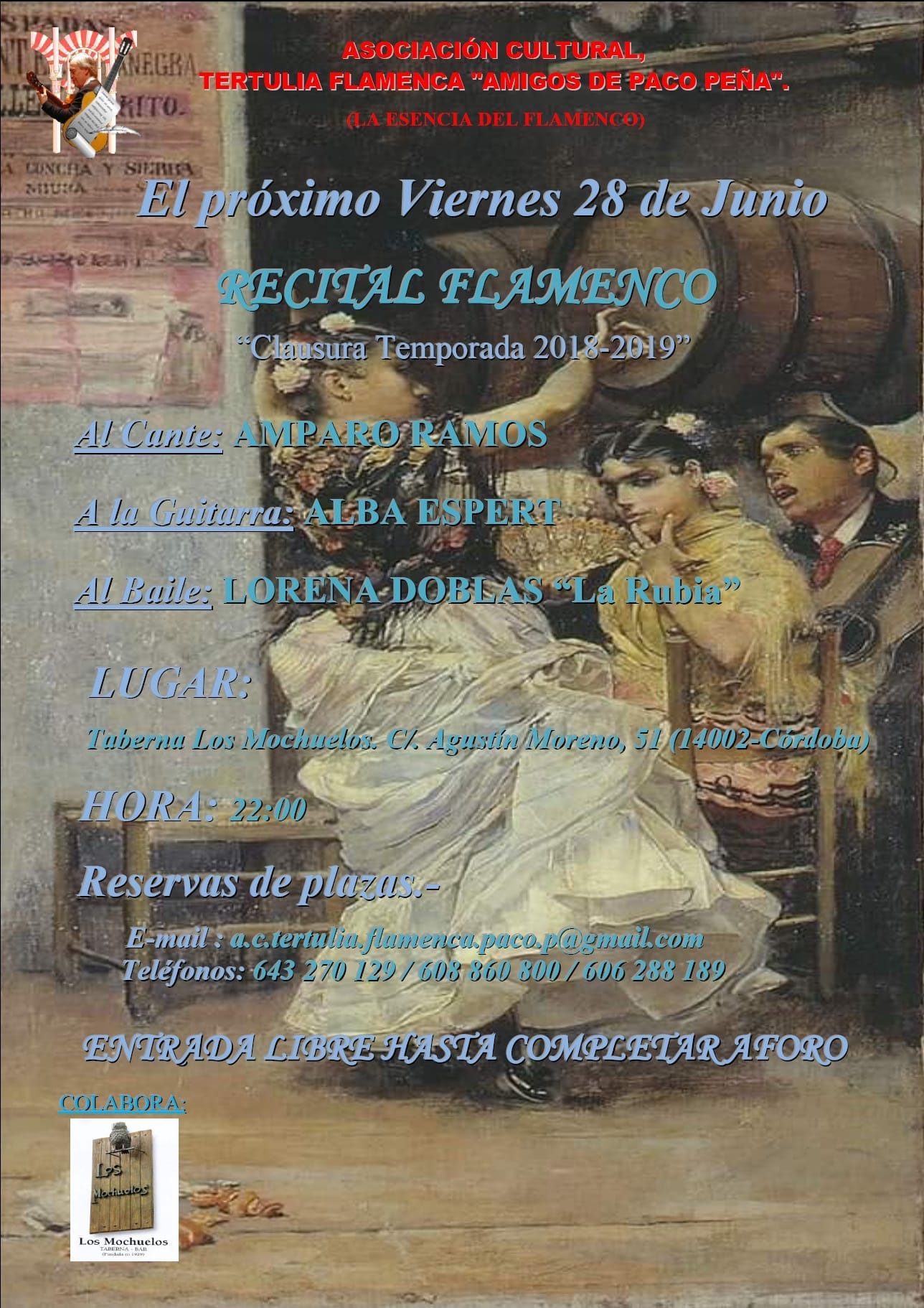 Dicho Recital tendrá lugar el día 28 de Junio a las 22:00 horas en la Sede Social de la Tertulia Flamenca "Amigos de Paco Peña", sita en la Taberna Los Mochuelos - C/ Agustín Moreno, 51)